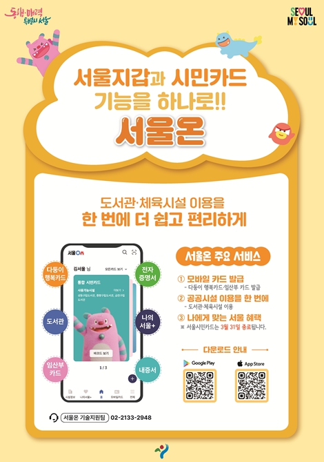 [코리아 이슈저널=최준석 기자] 서울시 모바일 행정서비스가 하나의 앱으로 통합된다. 서울시는 공공시설 이용을 위해 운영해 온 ‘서울시민카드’ 모바일 앱 서비스를 3월 31일 종료하고 관련 기능을 서울시 통합 모바일 플랫폼 ‘서울온’으로 일원화한다고 밝혔다.