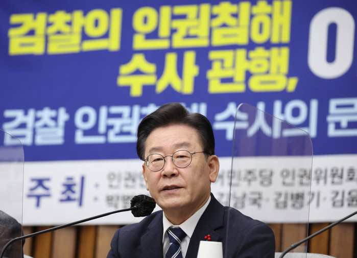 이 대표는 인사말에서 "윤석열 정부의 검찰은 민주주의 파괴의 도구로 전락했다"며 "야당의 정적을 향해선 없는 사실도 조작해서 보복의 칼날을 세우고 있다"고 비난했다.