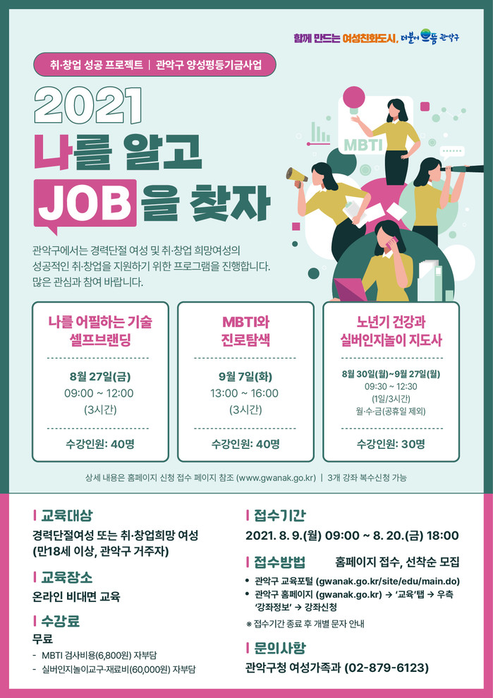 모든 강좌는 무료로 오는 8월 27일부터 9월 27일까지 진행되며, 관악구에 거주하고 있는 만18세 이상의 경력단절여성 또는 취·창업희망 여성이면 누구나 신청할 수 있다.