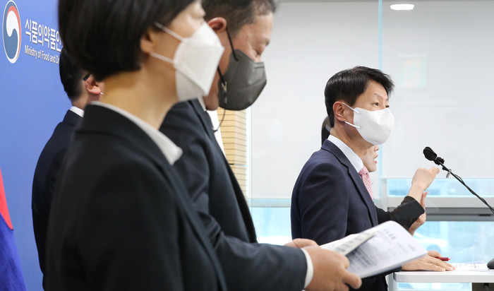 ▲ 김강립 식품의약품안전처장(오른쪽)이 27일 오후 충북 청주시 식약처 브리핑룸에서 열린 미국 화이자사가 개발한 먹는 코로나19 치료제 '팍스로비드' 긴급 사용 승인과 관련한 브리핑을 마친 뒤 취재진의 질문에 답변하고 있다. 2021.12.27 [연합뉴스 제공]