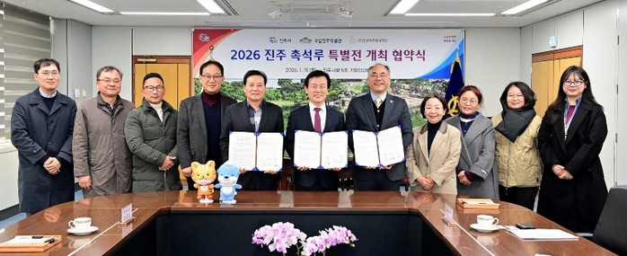 진주시는 15일 시청 5층 기업인의 방에서 ‘국립진주박물관’, ‘(사)진주목문화사랑방’과 '2026 진주 촉석루 특별전'의 개최를 위한 업무협약(MOU)을 체결했다고 밝혔다.