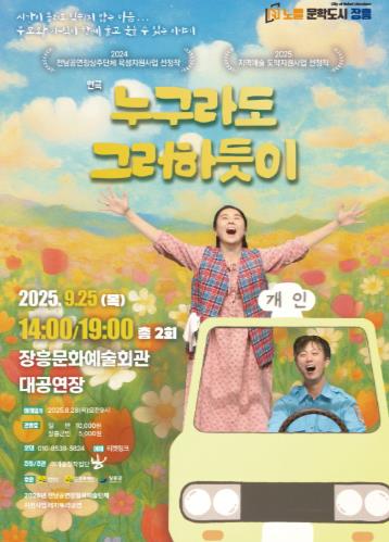 [코리아 이슈저널=김윤영 기자] 장흥군은 공연장협력예술단체 창작연극 ‘누구라도 그러하듯이’ 공연을 오는 9월 25일 14시, 19시 2회에 걸쳐 장흥문화예술회관에서 개최한다.