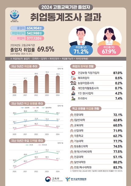 2024년도 졸업자 취업률 69.5%: 일반대학 62.8%, 전문대학 72.1%, 대학원 82.1%