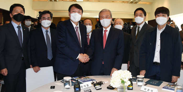 | ▲ 국민의힘 윤석열 대선 후보가 15일 서울 용산구 그랜드 하얏트 서울 호텔에서 열린 만화로 읽는 오늘의 인물이야기 '비상대책위원장-김종인' 출판기념회에 참석해 김 전 비대위원장과 악수하고 있다. 왼쪽부터 국민의힘 김기현 원내대표, 김동연 전 경제부총리, 윤 후보, 김 전 비대위원장, 금태섭 전 의원, 국민의힘 이준석 대표. 2021.11.15 [국회사진기자단] |