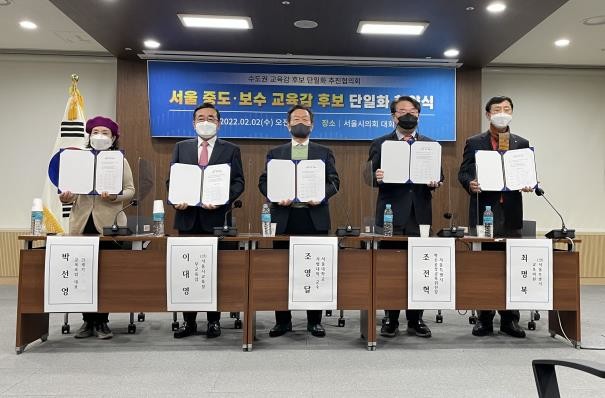 | ▲ 서울 중도·보수 교육감 후보 단일화 협약식 [수도권 교육감 후보 단일화 추진협의회 제공] |