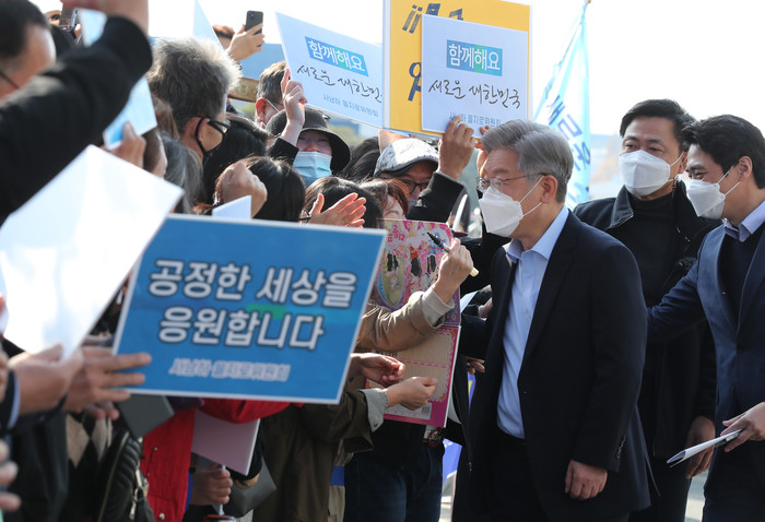 | ▲ 더불어민주당 이재명 대선후보가 '매타버스'(매주 타는 민생버스) 행보 사흘째인 14일 오후 경남 사천시 한국항공우주산업(KAI)에 도착, 지지자들과 인사하고 있다. 2021.11.14 [연합뉴스 제공] |