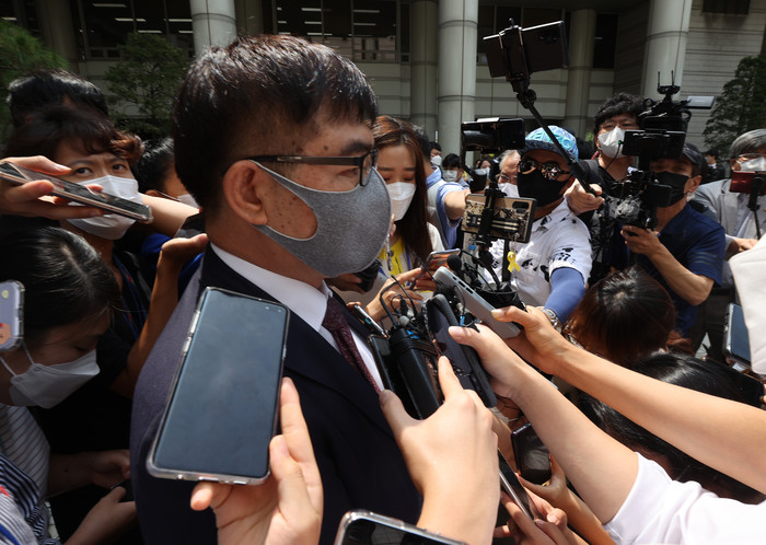 | ▲ 자녀 입시비리와 사모펀드 의혹으로 항소심에서 징역 4년을 선고받은 정경심 동양대 교수의 변호인 김칠준 변호사가 11일 오전 서울 서초구 서울고법에서 열린 항소심 선고공판이 끝난 뒤 법정을 나서며 취재진의 질문에 답하고 있다.[연합뉴스 제공] |