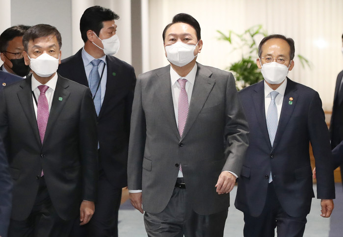 | ▲ 윤석열 대통령이 첫 대외 현장 행보로 13일 오전 서울 중구 명동 국제금융센터에서 열린 거시금융상황 점검회의에 참석하고 있다. 왼쪽은 최상목 경제수석, 오른쪽은 추경호 경제부총리 겸 기획재정부 장관. 2022.5.13 |