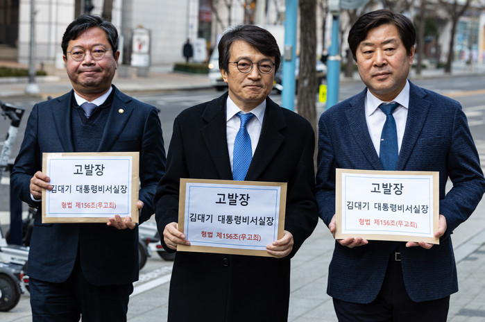 김의겸 의원과 당 법률위원장인 김승원 의원은 이날 대통령실이 김 의원을 명예훼손 혐의로 고발한 사건과 관련해, 김대기 대통령 비서실장을 무고 혐의로 서울경찰청에 고발했다.