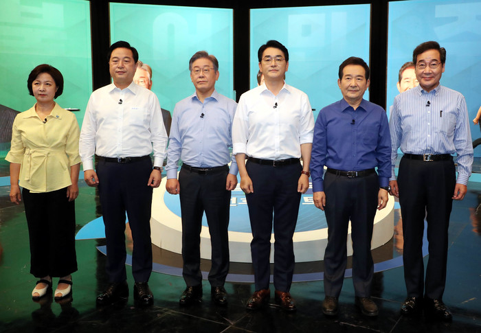 | ▲ 더불어민주당 대권주자인 이낙연(오른쪽부터), 정세균, 박용진, 이재명, 김두관, 추미애 후보가 17일 서울 상암동 DDMC에서 채널A 주최로 열린 더불어민주당 제20대 대선후보 토론회에서 기념촬영을 하고 있다. 2021.8.17 [국회사진기자단] |