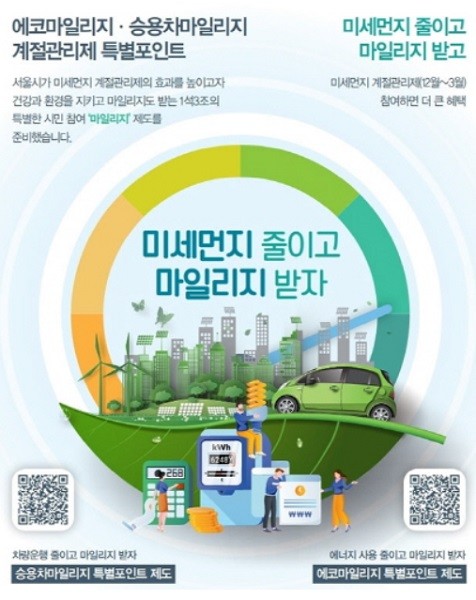 '에코마일리지'는 서울시의 가정, 기업, 학교 등에서 전기·수도·도시가스(지역난방) 등 에너지를 절약하면 온실가스 절감 실적에 따라 마일리지를 주는 제도로, 특히 '미세먼지 계절관리제'는 고농도 미세먼지가 빈번히 발생하는 12월부터 3월까지(4개월) 평시보다 강력한 감축 정책을 추진해 겨울철 난방 사용으로 발생하는 고농도 미세먼지를 줄이기 위한 집중관리 대책이다.