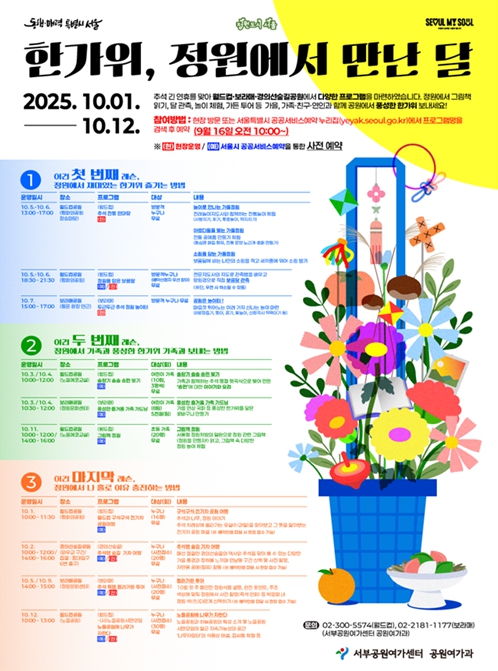[코리아 이슈저널=최준석 기자] 선선한 가을 바람과 함께 나들이하기 좋은 추석 연휴, 가까운 자연속에서 특별한 추억을 남길 수 있도록 서울의 공원 13곳에서 42개 프로그램을 선보인다. 명절 분위기를 물씬 느낄 수 있는 민속놀이부터 공원의 자연을 느낄 수 있는 생태 관찰, 해설 산책, 전시 관람 등 다양한 즐길거리로 이번 긴 추석을 알차게 채워보자.