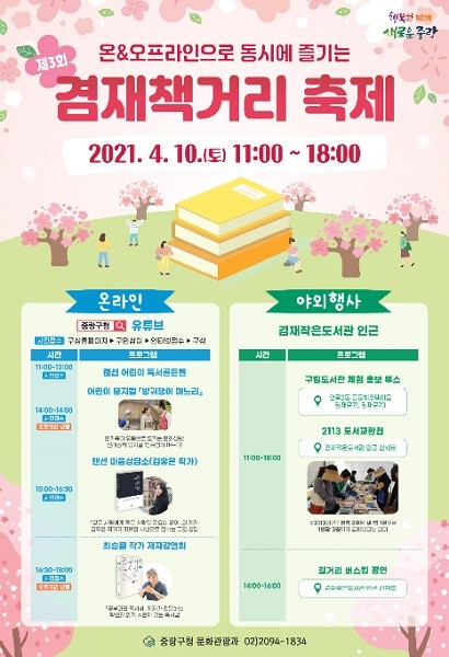 온라인 행사는 중랑구청 유튜브채널을 통해 실시간으로 만나볼 수 있다. 자라나는 아이들을 위한 프로그램으로 랜선 어린이 독서골든벨(11시~12시), 전래동화 뮤지컬 ‘방귀쟁이 며느리’(14시~14시 50분)를 진행한다.
