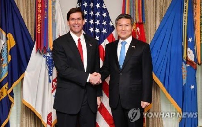 | ▲ 정경두 국방부 장관(오른쪽)과 마크 에스퍼 미국 국방부 장관[출처=연합뉴스] |