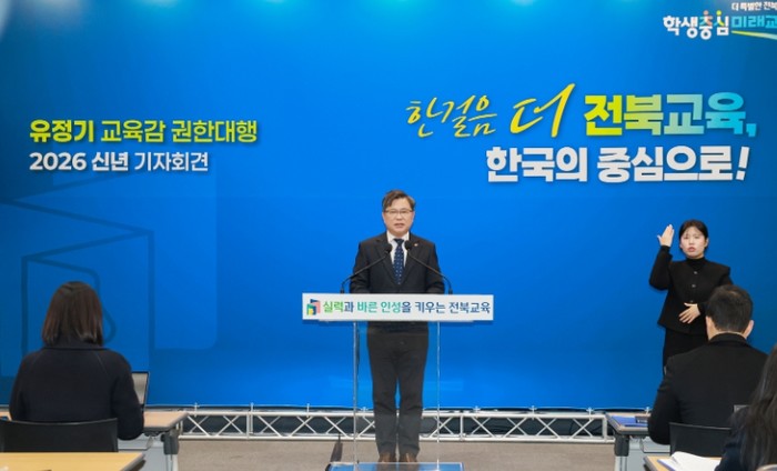 유정기 권한대행은 본청 강당에서 2026년 신년 기자회견을 열고 “올해는 2025년 현장에서 검증된 학력신장과 책임교육의 성과를 정책의 출발선으로 삼아 그 흐름을 더욱 단단히 이어갈 것”이라며 이렇게 말했다.