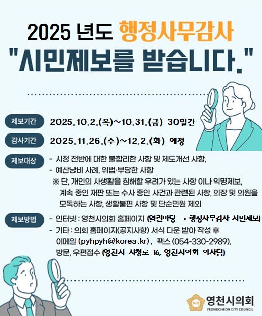 [코리아 이슈저널=김태훈 기자] 영천시의회는 2025년도 행정사무감사를 앞두고 10월 31일까지 시민제보를 받는다.