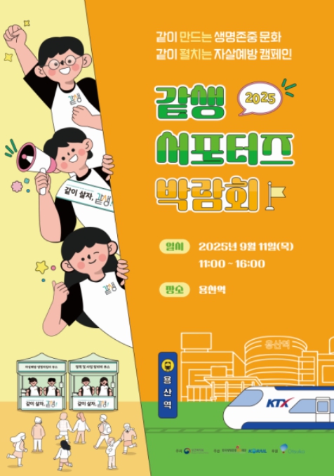 이러한 일환 중의 하나로 보건복지부와 한국생명존중희망재단은 자살예방주간을 맞아 ‘자살예방의 날 기념행사’에 이어 9월 11일 11:00~16:00 용산역에서 자살예방 및 생명존중문화 조성을 위한 ‘2025 같이 살자, 같생 서포터즈 박람회’를 개최한다.
