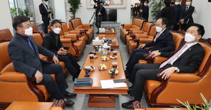 | ▲ 더불어민주당 윤호중 원내대표와 국민의힘 김기현 원내대표가 28일 서울 여의도 국회 운영위원장실에서 여야교섭단체 원내대표 회동을 하고 있다. 왼쪽부터 더불어민주당 윤호중 원내대표, 한병도 원내수석부대표, 국민의힘 추경호 원내수석부대표, 김기현 원내대표. 2021.12.28 [연합뉴스 제공] |