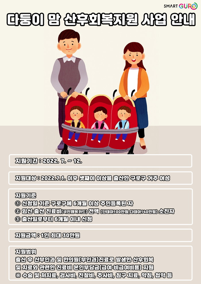 구로구는 지난달 서울시 다둥이맘 산후 회복지원사업 공모에 선정돼 확보한 시비 2천만원으로 이번 사업을 진행한다.