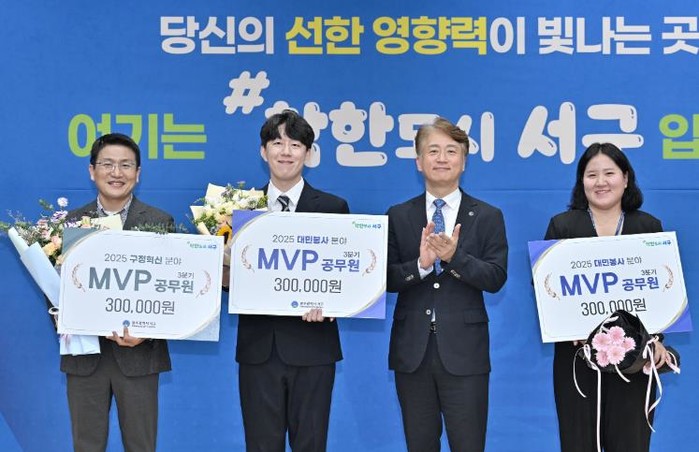 [코리아 이슈저널=김종오 기자] 광주광역시 서구가 올해 3분기‘MVP 공무원’으로 경제과 홍석기 서구소상공인경영지원센터장, 기후환경과 최은지 주무관, 세무1과 박영준 주무관을 선정했다.