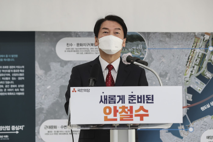 ▲ 국민의당 안철수 대선 후보가 23일 부산 동구 부산항국제여객터미널 내 북항재개발 홍보관에서 기자회견을 하고 있다. 2021.12.23 [연합뉴스 제공]