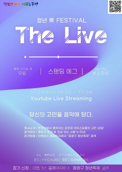 ‘2020 중랑구 온라인 청년축제’는 중랑구 청년축제기획단이 직접 기획하고 운영하는 축제로, 코로나19로 지친 청년들을 위해 마련됐다. 감염병 확산 방지를 위해 온라인 비대면으로 운영하는 이번 축제는 온라인 화상프로그램 ‘ZOOM’과 중랑구청 유튜브 공식채널 실시간 송출로 진행된다.