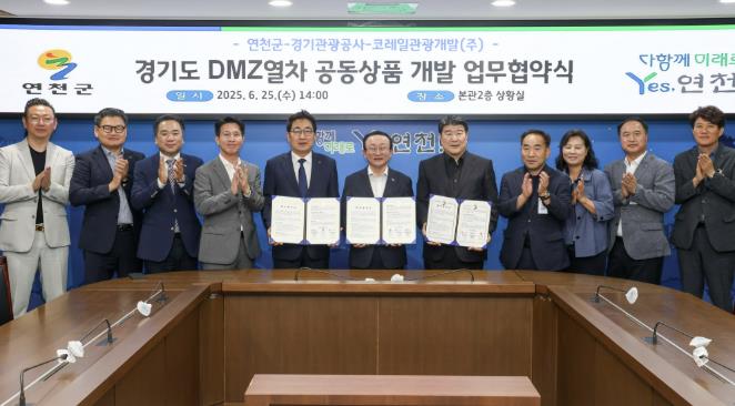 [코리아 이슈저널=홍춘표 기자] 연천군은 지난 25일 본관 2층 상황실에서 경기관광공사, 코레일관광개발(주)와 수도권 북단의 관광자원 활성화를 위한 ‘경기도 DMZ열차 공동상품 개발에 관한 업무협약’을 체결했다고 밝혔다.