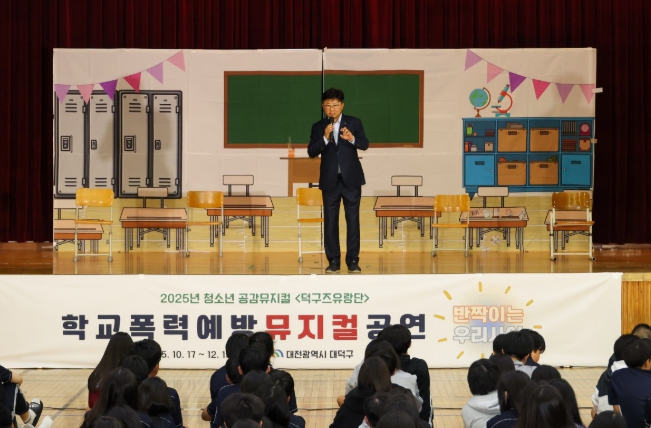 [코리아 이슈저널=홍종수 기자] 대전 대덕구가 17일부터 약 3개월 동안 지역 초·중학교 6곳을 대상으로 찾아가는 학교폭력 예방 뮤지컬 ‘덕구즈 유랑단’을 운영한다고 밝혔다.