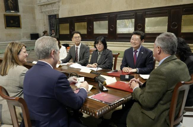| ▲ 이상일 용인특례시장이 지난해 2월 22일 스페인 세비야 시청을 방문해 호세 루이스 산즈 시장과 우호교류의향서를 교환한 뒤 시 관계자들과 교류 협력 방안을 논의하는 모습 |