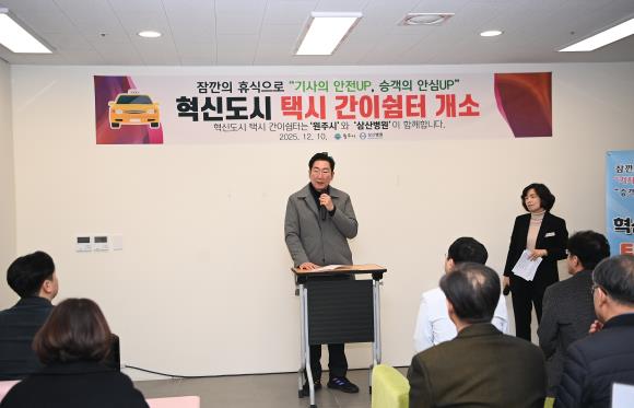 [코리아 이슈저널=최제구 기자] 원주시는 혁신도시 내 택시 종사자들의 근로 여건 개선과 복리 증진을 위해, 삼산병원에 ‘혁신도시 택시 간이쉼터’를 조성하고 10일 오전 11시 개소식을 열었다.