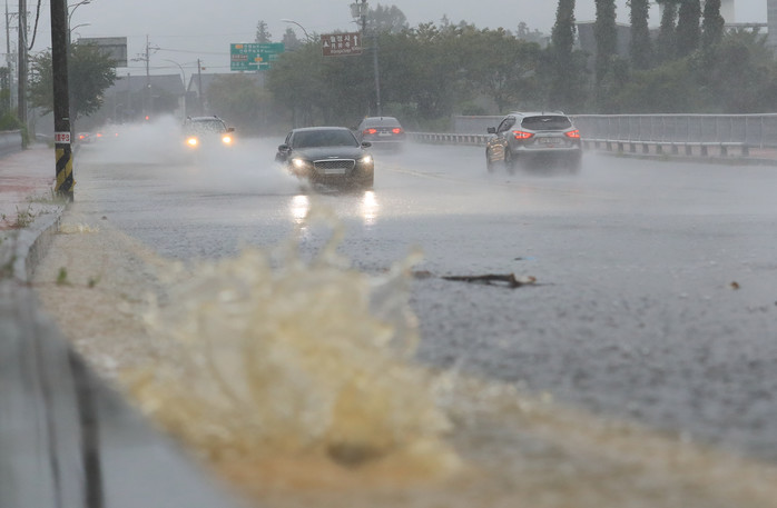 [열린의정뉴스 = 김윤영 기자] 태풍 찬투의 영향으로 제주도 육상 전역에 호우특보가 내려진 14일 오전 제주시 한북로의 도로가 물에 잠겨 차량이 서행하고 있다. 2021.9.14