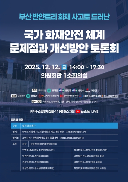 [코리아 이슈저널=홍종수 기자] 국회의원 용혜인(기본소득당‧행정안전위원회)은 12월 12일 오후 2시, 국회의원회관 제1소회의실에서 소방방재신문사‧한국화재소방학회‧한국소방기술사회‧한국소방감리협회 공동주관으로 ‘부산 반얀트리 화재 사고로 드러난 국가 화재안전체계 문제점과 개선방안 토론회’를 개최했다.
