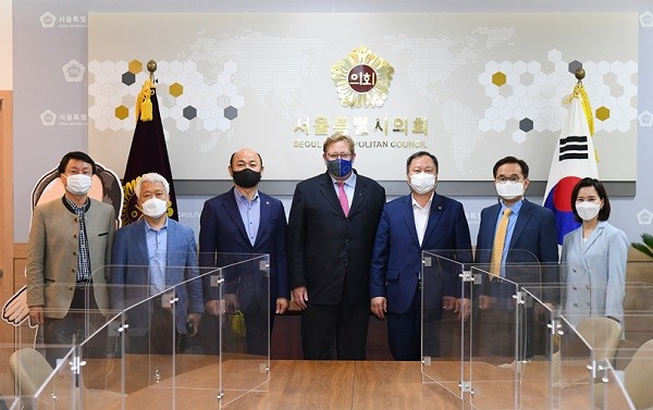 | ▲ 황인구 서울시의원(왼쪽에서 세 번째)이 베른하르트 젤리거(Dr. habil Bernhard Seliger) 한스 자이델 재간 한국 사무소 대표(가운데)와 김인호 서울시의회 의장 등과 기념촬영을 하고 있다.[출처=서울시의회] |