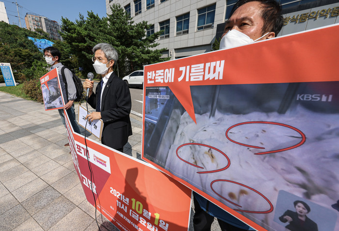 [열린의정뉴스 = 김윤영 기자] 1일 오전 서울 양천구 서울지방식품의약품안전청 앞에서 열린 'SPC 던킨도너츠 식품위생법 위반 고발' 기자회견에서 대책위 공동대표인 권영국 변호사(가운데)가 고발 접수의 의의와 SPC의 대응에 대한 비판 발언을 하고 있다.