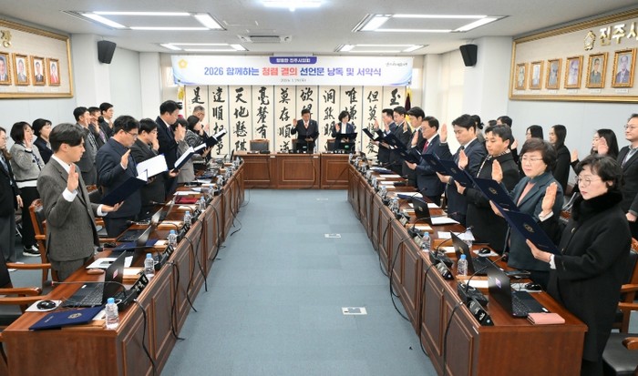 [코리아 이슈저널=김태훈 기자] 진주시의회는 29일 제271회 임시회를 앞두고 청렴한 의정 실천을 위한‘2026 함께하는 청렴결의 선언문 낭독 및 서약식’을 개최했다.