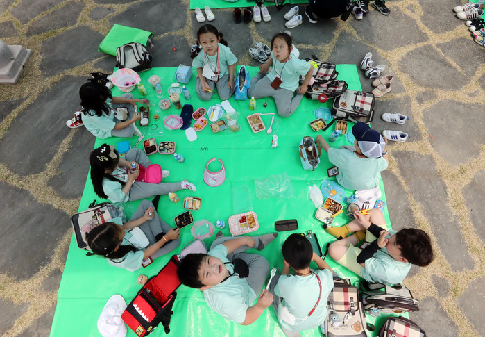[열린의정뉴스 = 김윤영 기자] 20일 오후 전남 곡성군 섬진강기차마을 내 장미공원에서 어린이들이 소풍 나와 점심을 먹고 있다. 2022.5.20