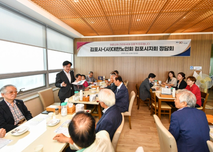 [코리아 이슈저널=홍춘표 기자] 김병수 시장이 지난 6일 (사)대한노인회 김포시지회 임원 및 14개 분회장과 함께 하는 정담회를 열고 노인 복지 현안에 대한 현장 의견을 경청했다. 말복을 앞두고 어르신들의 건강을 기원하는 자리로 마련된 이번 정담회는 덕담을 나누는 자리를 넘어 노인복지의 현재와 미래를 논하는 의미있는 시간으로 진행됐다.