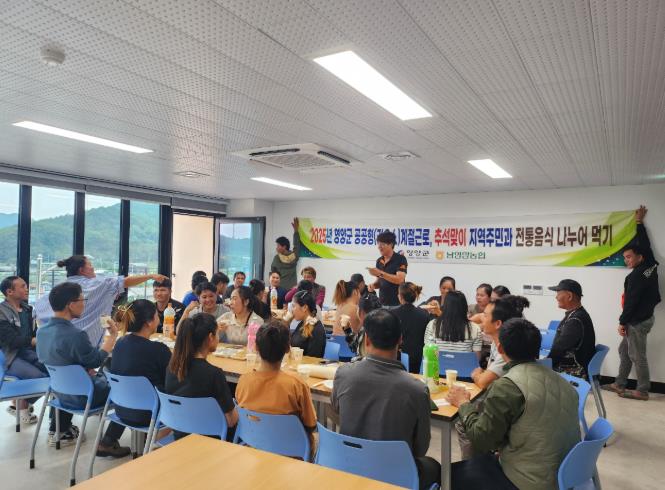 [코리아 이슈저널=김태훈 기자] 남영양농협은 지난 10월 3일 영양군 농업근로자 기숙사에서 라오스 출신 공공형 계절근로자 30명과 지역주민이 함께하는‘추석맞이 전통음식 나누기' 행사를 가졌다.