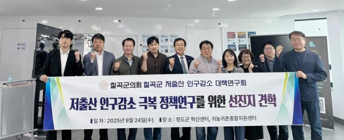 [코리아 이슈저널=김태훈 기자] 칠곡군의회 의원연구단체인 “칠곡군 저출산 인구감소 대책연구회”는 9월 24일, 도내에서 생활인구 증가율이 가장 높은 청도군을 방문하여 청년 및 귀농·귀촌 정책을 통한 인구유입 방안에 대하여 벤치마킹을 진행했다.