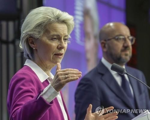▲ 30일(현지시간) 벨기에 브뤼셀에서 열린 유럽연합(EU) 특별정상회담 후 샤를 미셸 EU 정상회의 상임의장(46·오른쪽)과 우르줄라 폰데어라이엔 EU 집행위원장(63)이 기자회견을 하고 있다. 이날 EU는 러시아 제재의 일환으로 연말까지 러시아산 원유 수입을 90%까지 줄이기로 합의했다. 2022.5.31