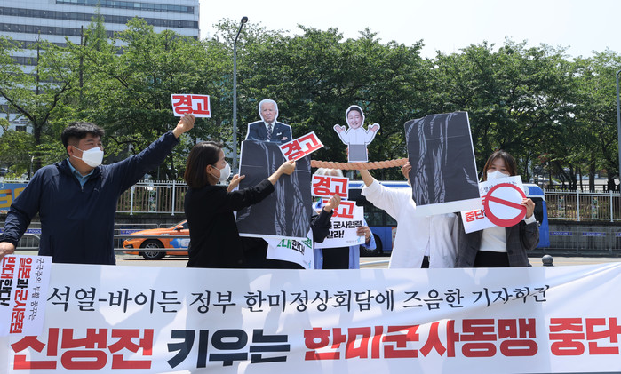 [열린의정뉴스 = 김윤영 기자] 17일 겨레하나 회원들이 서울 용산구 전쟁기념관 앞에서 열린 한미군사동맹 중단 촉구 기자회견에서 윤석열 대통령이 외줄을 타는 퍼포먼스를 하고 있다. 2022.5.17