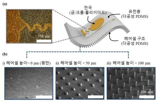 연구팀은 다공성 헤어셀 구조(다공성 표면 위에 여러 개의 섬모가 형성돼 있는 구조)의 맥파 센서를 개발, 땀 투과도를 높이고 피부와의 접촉 면적도 획기적으로 넓혔다.