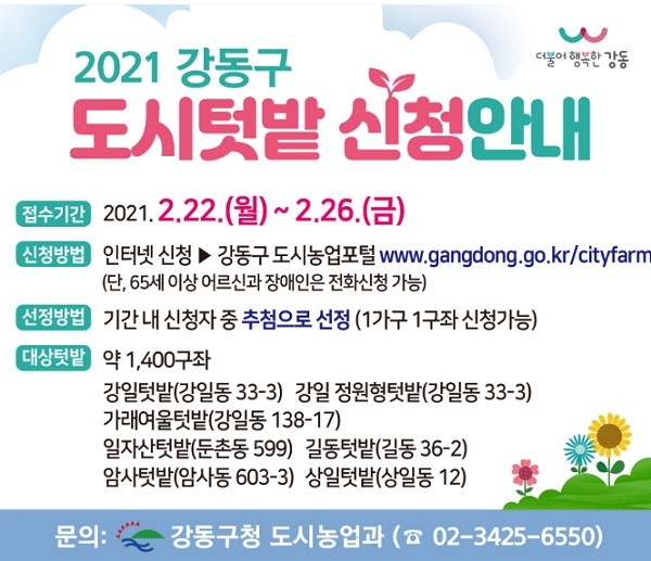 [열린의정뉴스 = 최성일 기자] 강동구(구청장 이정훈)는 오는 2월 22일부터 26일까지 「2021년도 강동구 도시텃밭」 참여자를 모집한다.