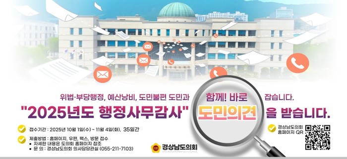 [코리아 이슈저널=김태훈 기자] 경상남도의회는 11월 5일부터 18일, 14일간 예정되어 있는 ‘2025년도 행정사무감사’를 앞두고 도민의 의견을 받는다고 밝혔다.