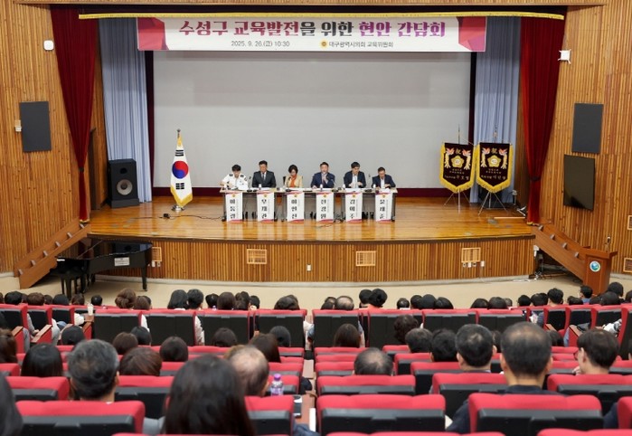 [코리아 이슈저널=김태훈 기자] 대구광역시의회 교육위원회는 지난 9월 26일, 대구창의융합교육원에서 수성구 지역 77개교 교장, 운영위원, 학부모 등과 함께 학교별 교육 현안 해결 및 정책 실현 방안 논의를 위한 간담회를 개최했다.