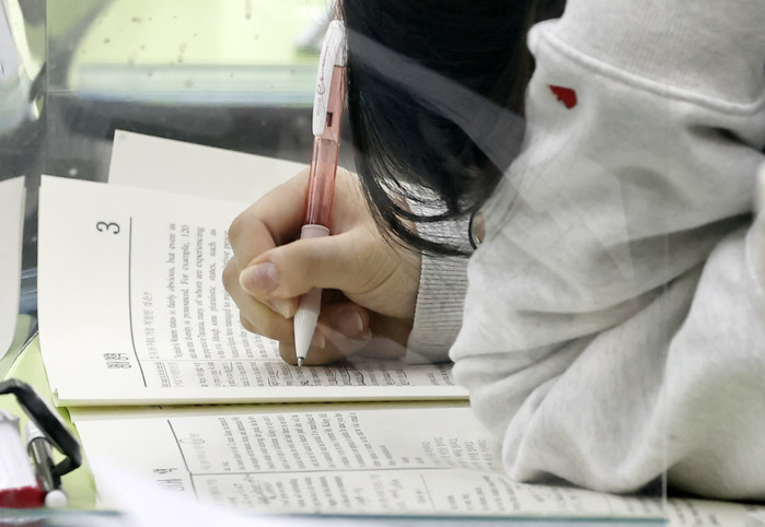 [열린의정뉴스 = 김윤영 기자] 2022학년도 대학수학능력시험을 사흘 앞둔 15일 오후 서울 양천구의 한 학원에서 수험생이 모의고사를 풀고 있다. 2021.11.15