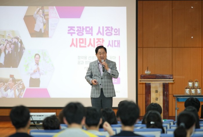 강연자로 나선 주광덕 시장은 다산 정약용 선생의 “꿈이 있는 사람에게 내일은 젊음이자 기대”라는 말을 인용해 진로를 고민하는 학생들에게 꿈의 가치와 소중함을 강조했다.