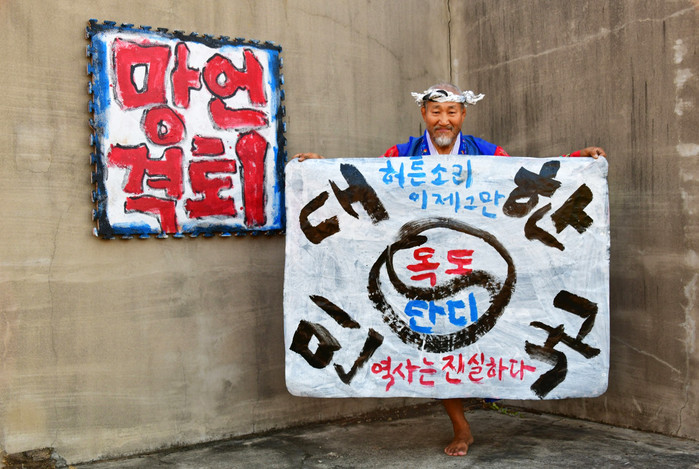 [열린의정뉴스 = 김윤영 기자] 18일 경북 경주시 감포읍 바닷가에서 서예가 김동욱씨가 일본의 독도 망언을 퇴치하기 위한 퍼포먼스를 하고 있다. 그는 "독도 역사 왜곡하면 일본 역사 왜곡된다"란 글을 쓴 뒤 칼을 들고 굿을 하는 행위예술을 했다. 2021.8.18