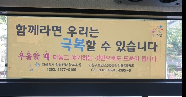 [열린의정뉴스 = 최성일 기자] 서울 노원구(구청장 오승록)가 우울증과 자살 예방 사업을 주민들에게 효율적으로 알리기 위해 마을버스 업체와 손을 잡았다.
