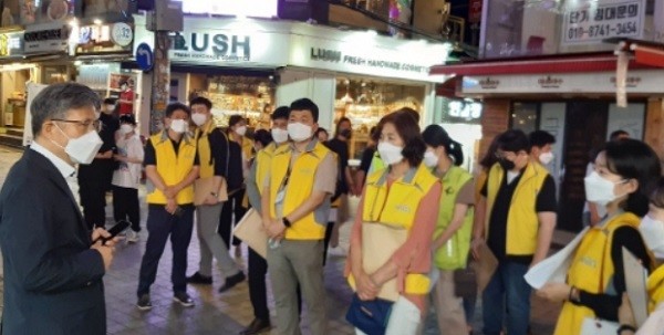 해당 기간 구는 전 직원을 활용해 주말 포함 일일 60명 점검반을 편성, 21시 30분부터 23시까지 홍대 일대 음식점, 주점 등을 대상으로 특별 방역 활동에 돌입한다.